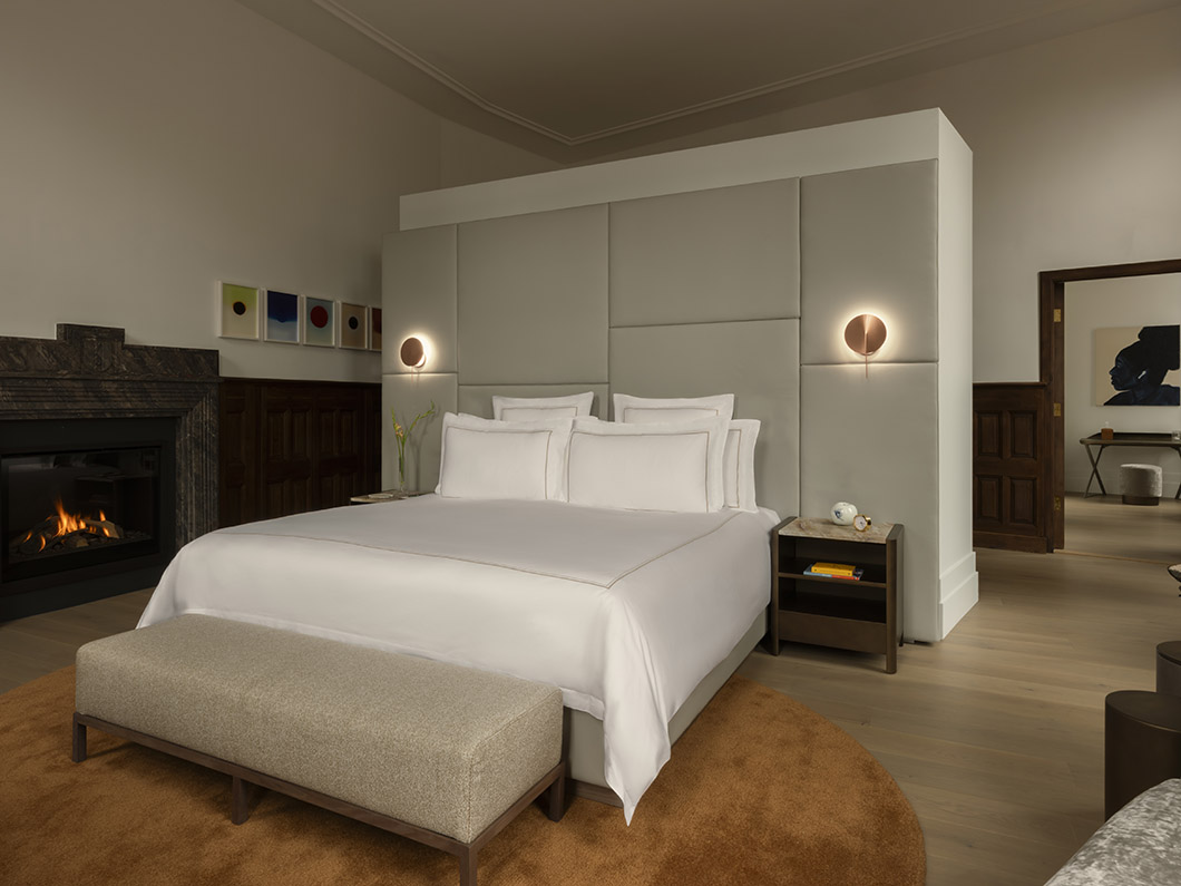 Historic features — such as pleated fabric headboards recalling judicial robes, painted woodgrain doors, and original stone flooring — are thoughtfully juxtaposed with contemporary interventions like bronze accents, mirrored bathroom enclosures, and refined natural materials.