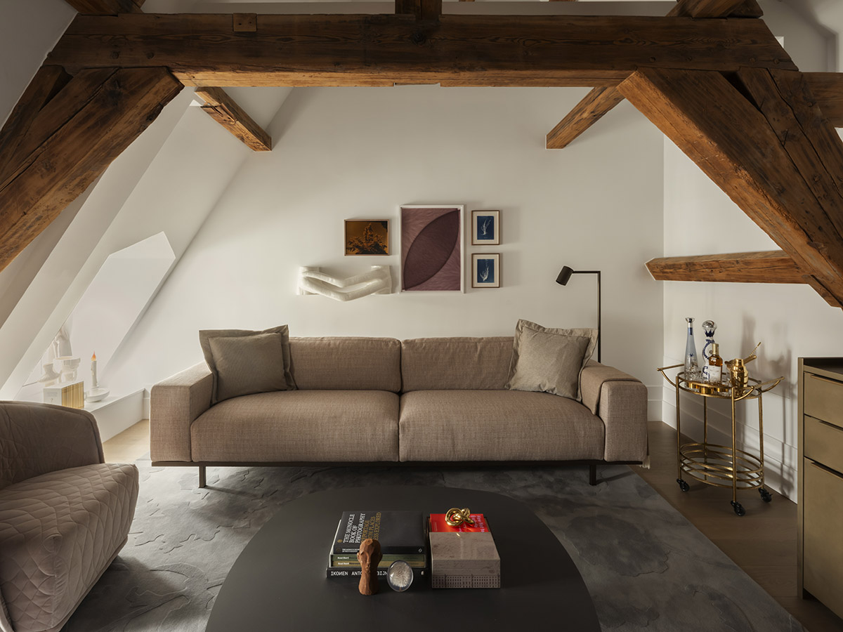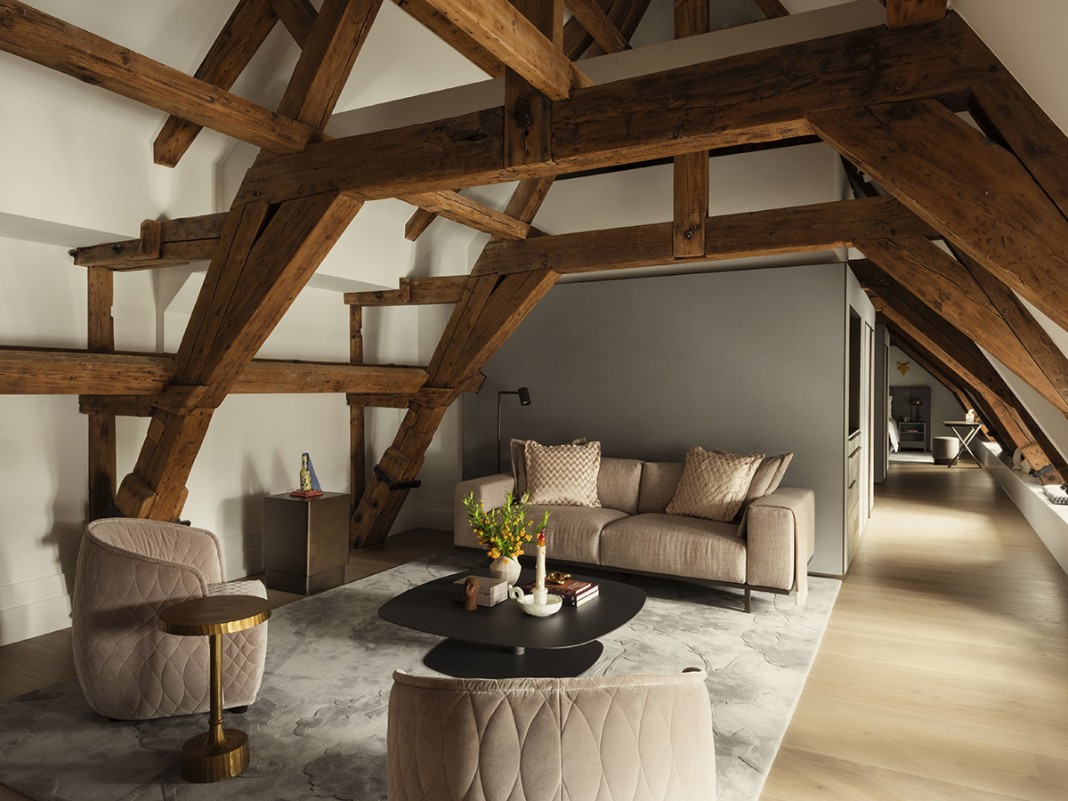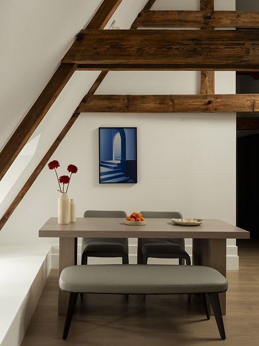 Nestled beneath its characteristic sloping beams, Prinsengracht House feels warm and inviting. Rich textures, soft lighting, and carefully selected details turn this top-floor retreat into a cocoon of comfort and quiet luxury.