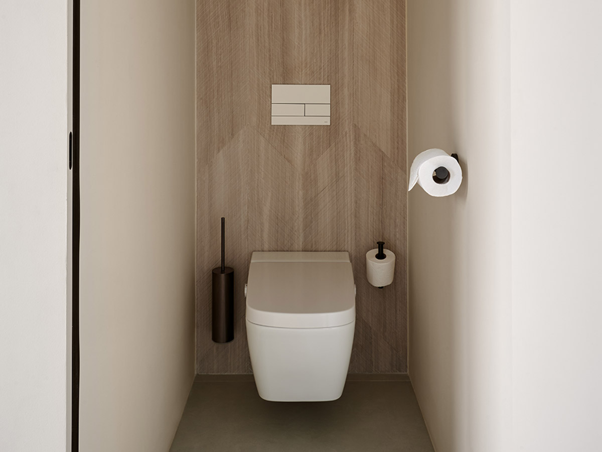 Onder de warmte van natuurlijk licht straalt deze badkamer eenvoud en elegantie uit. Het middelpunt, een robuuste, massieve wastafel, bepaalt de toon. Deze wordt aangevuld met de textuurrijke diepte van rechthoekige Salvatori tegels. Contrasterende strakke kranen van zwart gunmetal benadrukken de tijdloze esthetiek, die zowel ruw als verfijnd is.