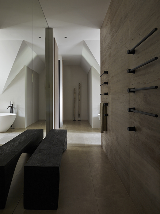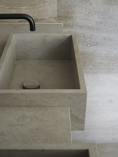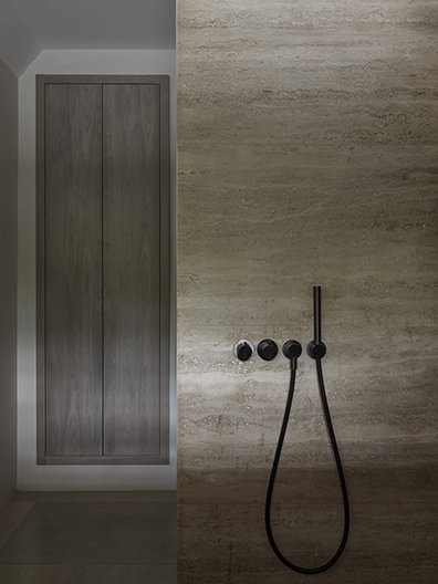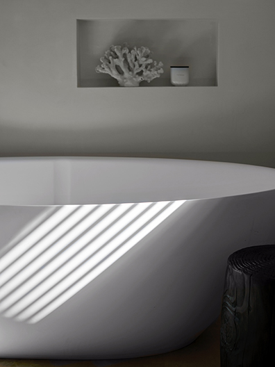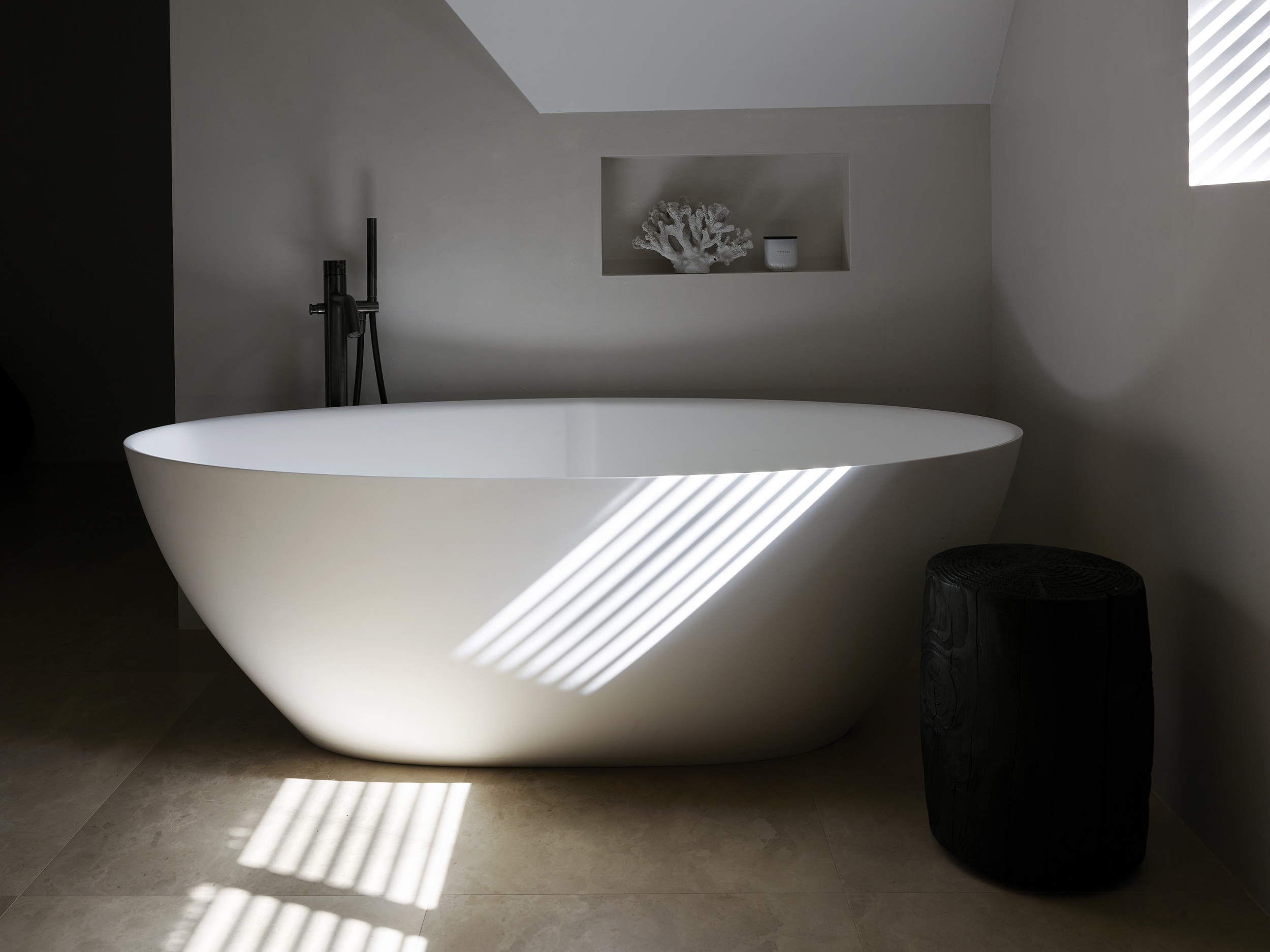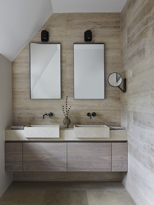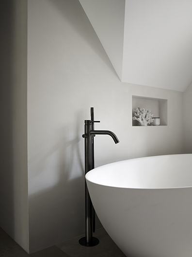 Centraal staat de dubbele wastafel met COCOON kranen en een geïntegreerde houten meubelwand. De strakke lijnen en het spel van natuurlijke materialen versterken het gevoel van eenvoud en verfijning. Het vrijstaande bad en de zorgvuldig geplaatste spiegels zorgen voor een ruimtelijke beleving waarin licht en reflectie subtiel samenwerken.