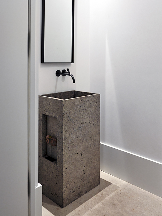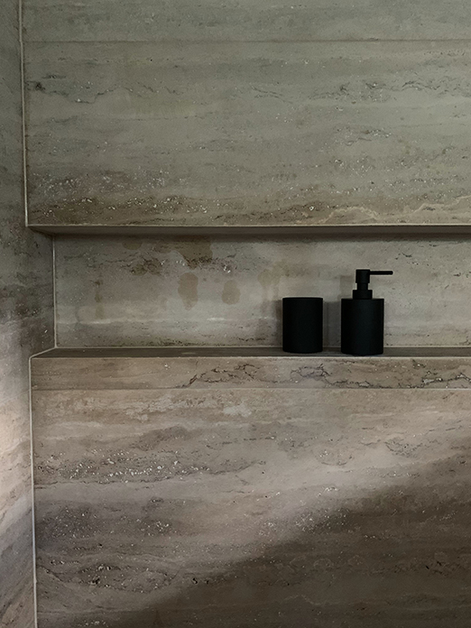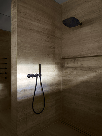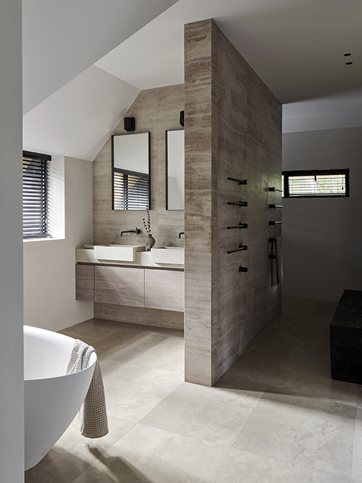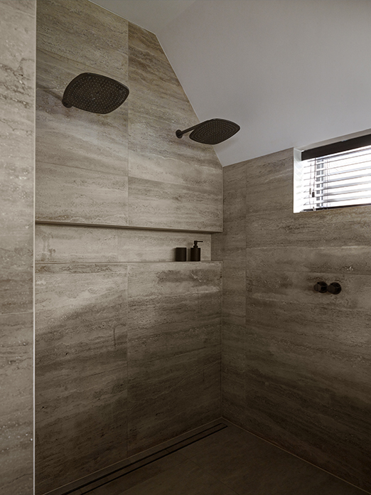 Een halfhoge wand verdeelt de ruimte functioneel zonder de openheid te verliezen, met zwarte accenten die voor contrast en balans zorgen. Zo ontstaat een serene plek voor dagelijkse verfrissing en ontspanning.