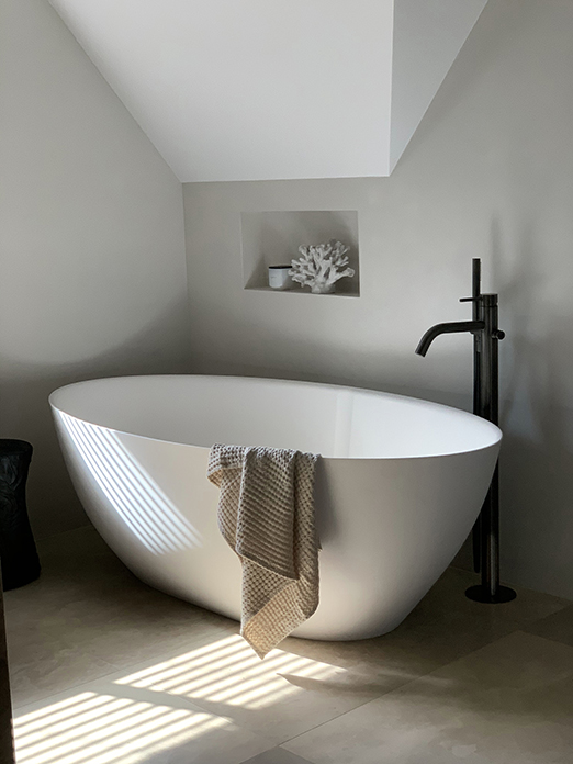De badkamer is ontworpen als een rustgevende ruimte. De zachte ton-sur-ton basis, bestaande uit lichte houten planken, bijpassend maatwerk en off-white pleisterwerk, vormt een kalm en tijdloos decor.