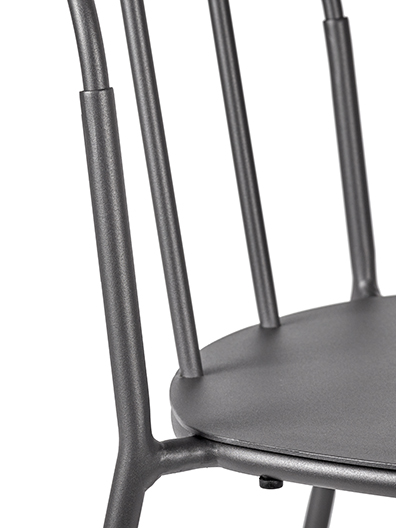 De eetstoelen zijn vervaardigd uit aluminium, gekozen vanwege de robuustheid en het lichte gewicht. De afwerking bestaat uit een elegante bruin-zwarte poedercoating. Dankzij het stapelbare ontwerp zijn de stoelen eenvoudig en efficiënt op te bergen, zonder concessies aan stijl of comfort.