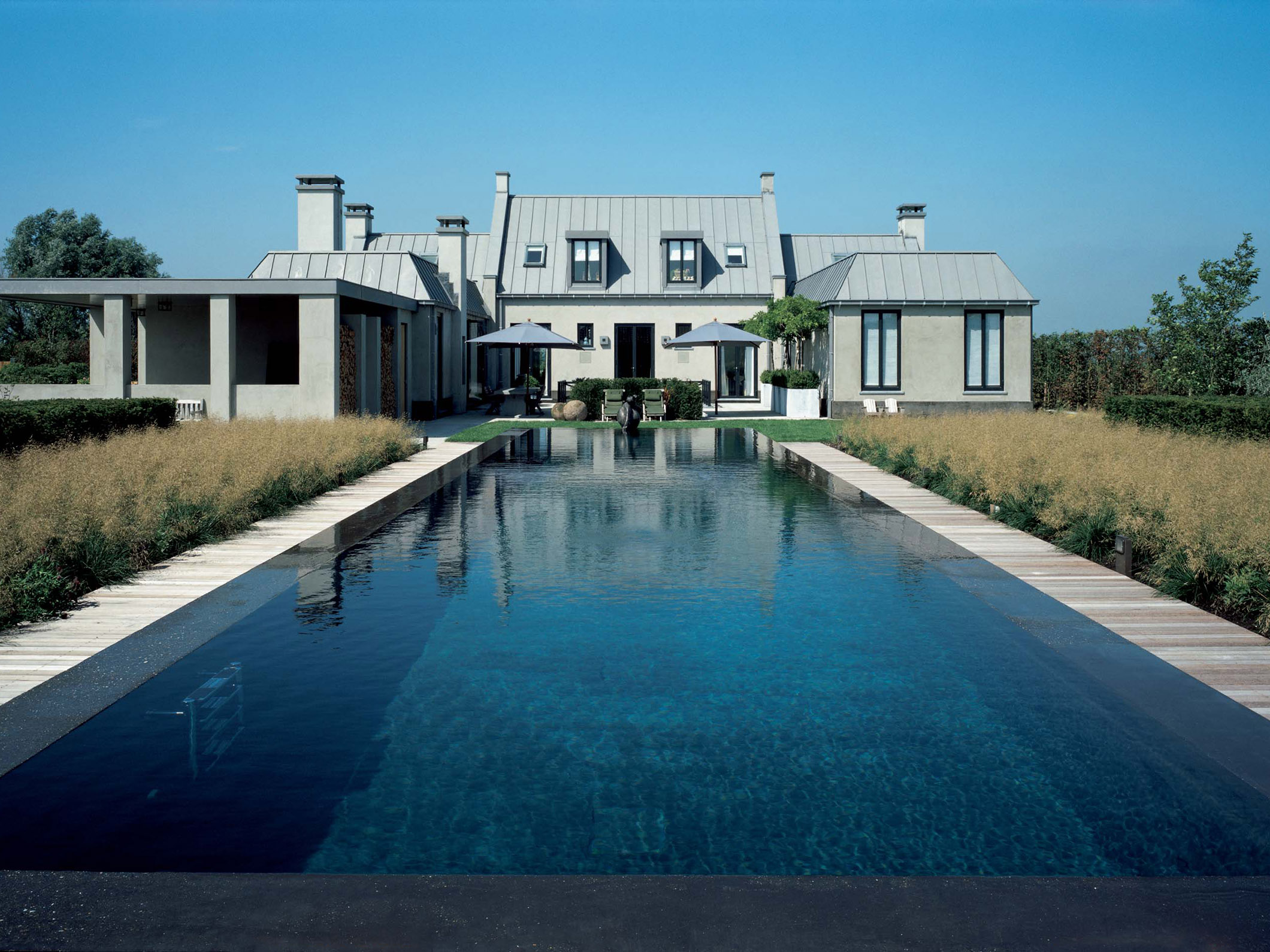 De kracht en het gevoel voor detail van Studio Piet Boon is balans, met als resultaat mooie zichtlijnen in dit huis. Rondom het huis, is een schitterende tuin door Piet Oudolf aangelegd. Aan de buitenkant van de woning is de gevel gestuukt om het geheel ingetogener te maken.