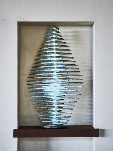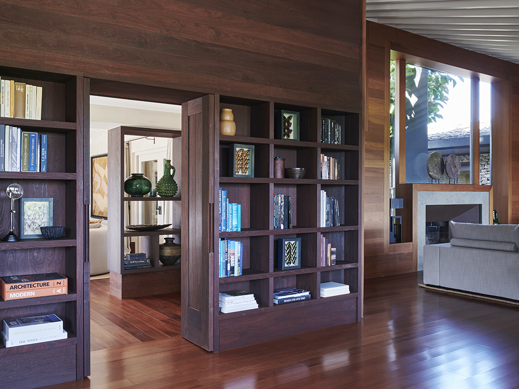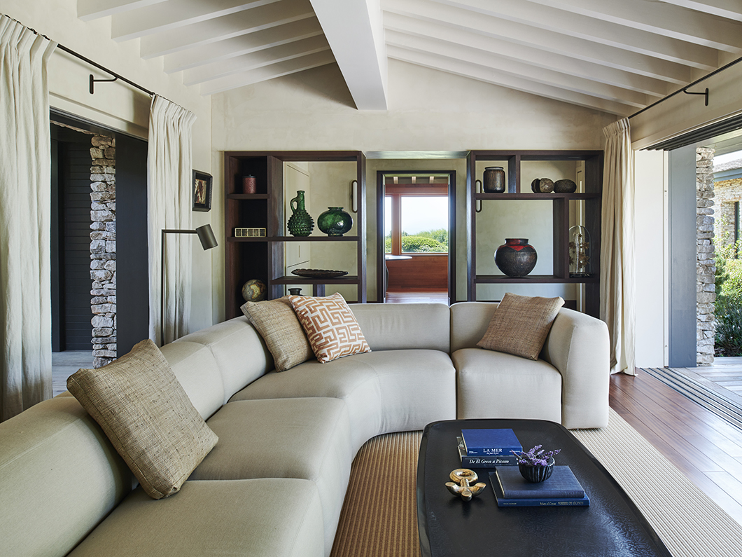 The central living room, redesigned to make the most of light and far-reaching views, is furnished with modular pieces and sculptural lighting. In addition to rich materials, personal objects, art, and accessories give the space character and depth. For the clients, passionate readers and collectors, these elements are not decoration but an essential part of their home.