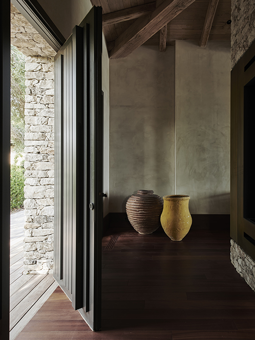 Throughout the house, colour and contrast play an important role. Travertine, lime plaster, bronze-toned details, and linen come together in a palette of earthy neutrals, complemented by warm nuances and refined accents. Openings frame nature, art, and water, while the walls serve as calm, supportive backdrops rather than barriers.