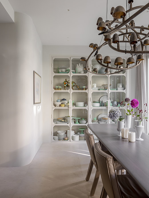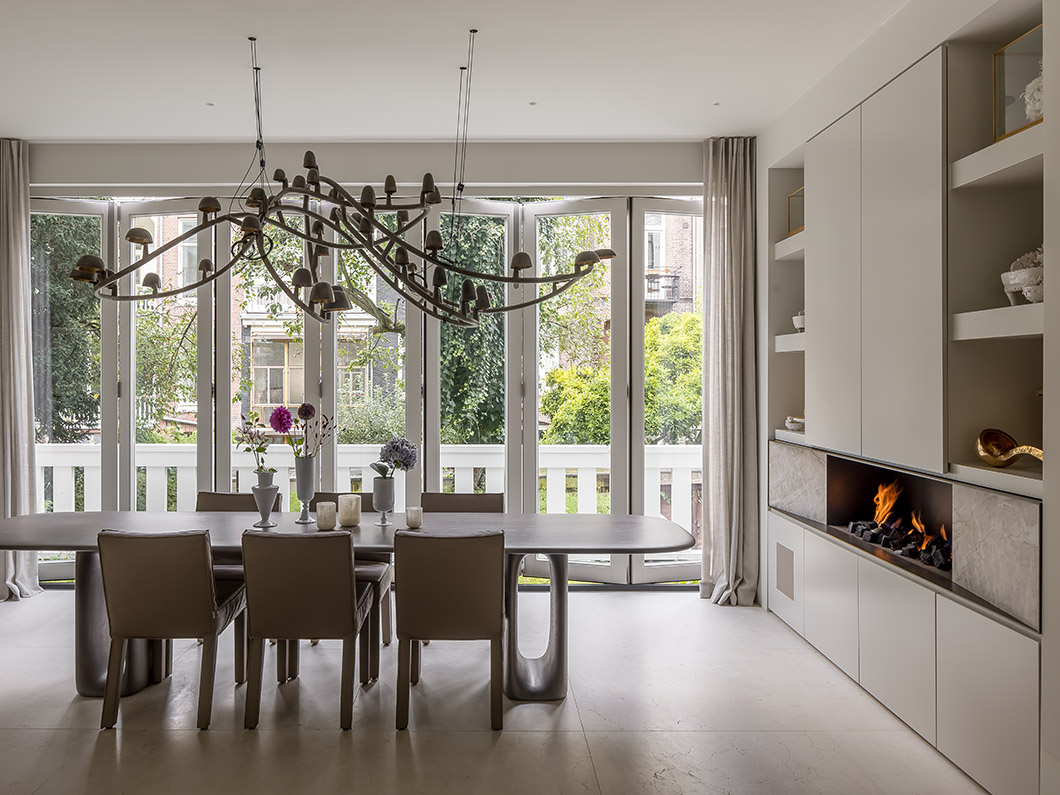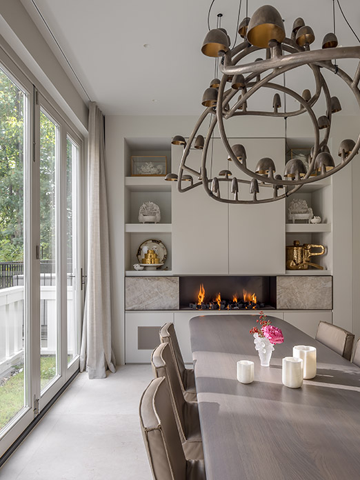 Adjacent to the kitchen, the dining area features a generous Van Rossum table illuminated by a Studio Molen light sculpture. The fireplace is integrated into a custom wall cabinet with storage and display elements, its side panels clad in Taj Mahal natural stone — echoing the kitchen. Opposite stands a glass-and-steel vitrine, offering a light counterbalance. Rounded corners return here as well, creating a natural flow throughout the space.