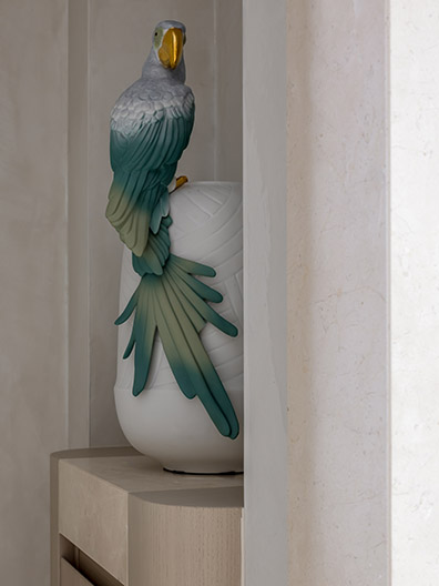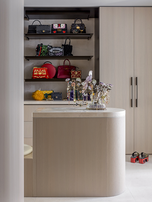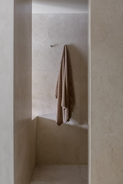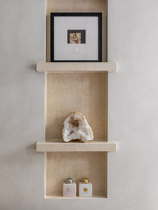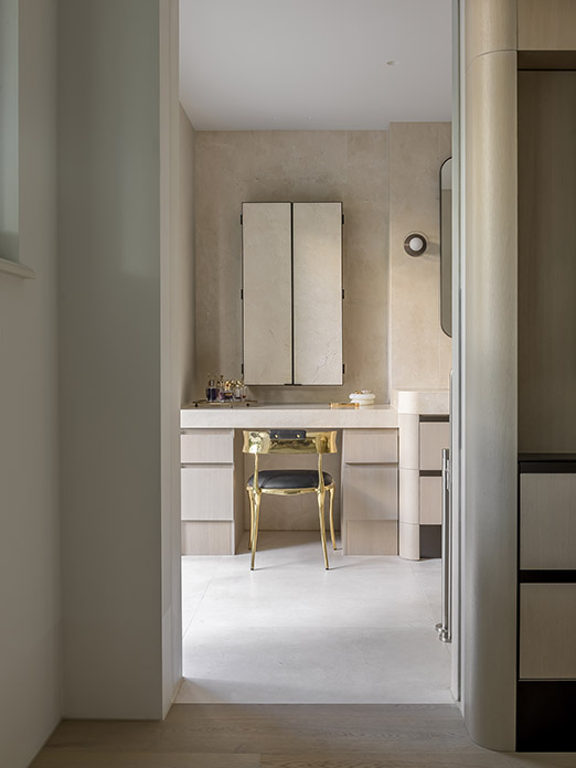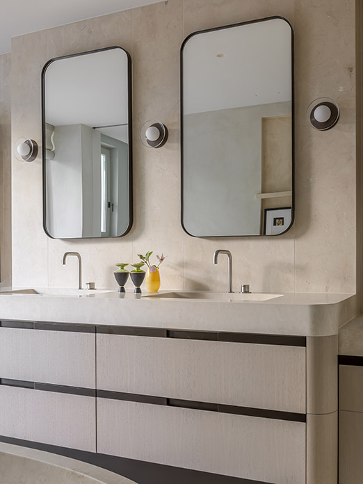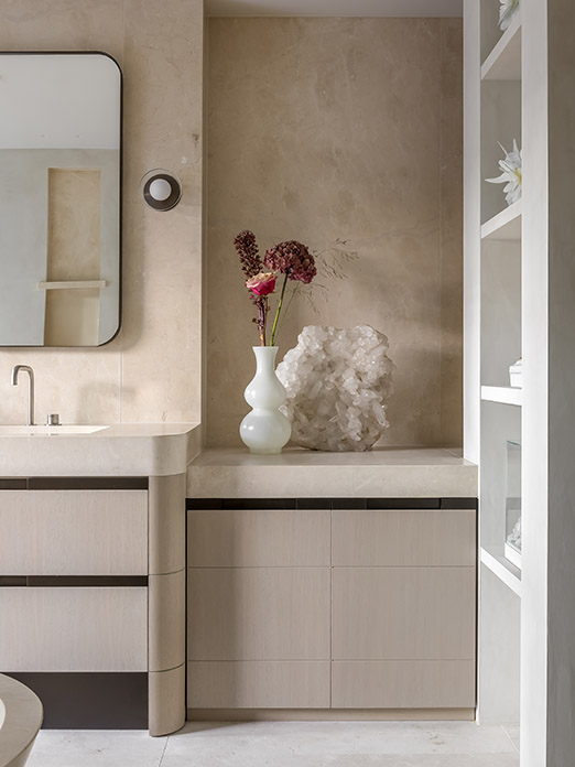 The bathroom is sculptural in character: both the freestanding bathtub and vanity are carved from a single block of natural stone. Soft curves in the furniture and mirror cabinet offset the geometry, while niches and indirect lighting enhance the sense of calm. The natural stone flooring mirrors that of the entrance, reinforcing the visual continuity.