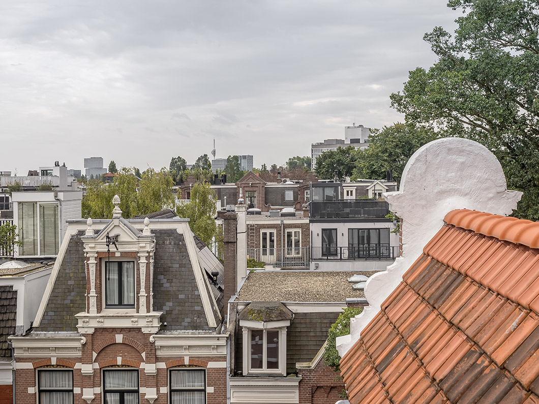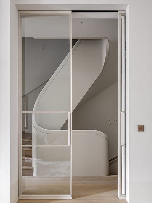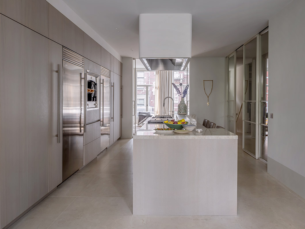 The entrance is a contemporary interpretation of classic Amsterdam entry halls. Floors and walls are clad in marble natural stone, creating an immediate sense of grandeur and calm. The detailing remains deliberately understated: clean lines, a subtle edge profile, and a natural transition toward the staircase. From here, the prominent stairway — a sculptural movement connecting all floors — leads upward. A large steel and glass partition offers a first view into the kitchen, ensuring architectural continuity throughout.