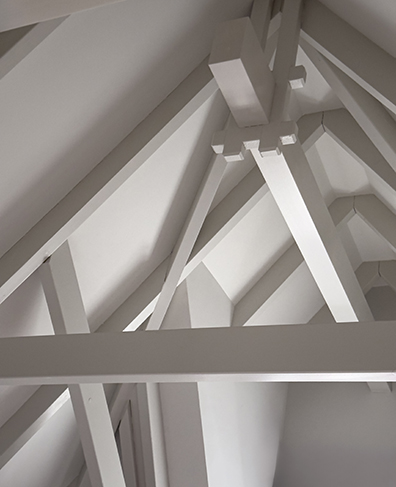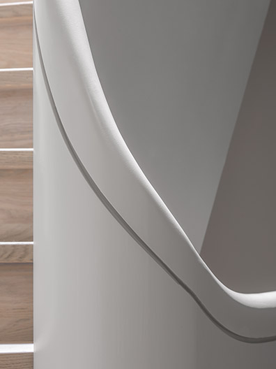 The staircase connects all levels in a single flowing spiral movement, from basement to top floor. Wooden treads wind around a central axis, while the handrail is seamlessly integrated into the wall. Above, a skylight introduces daylight deep into the stairwell, highlighting the sculptural form.