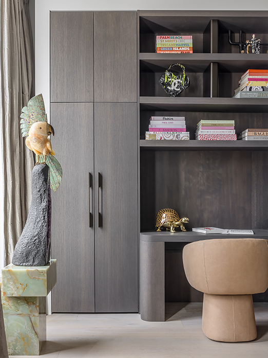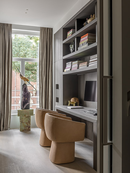 Next to the living area lies the home office with two workstations. Dark wood and bronze detailing return here, creating a calm and focused workspace.
