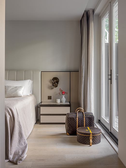 The primary bedroom, located at garden level, radiates peace and privacy. The bed features an integrated headboard with bronze details and Ochre bedside lamps.