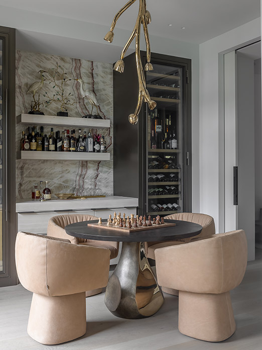 The first floor features a bespoke bar in white travertine with an onyx back wall. Two bronze climate cabinets frame the composition, balancing luxury with warmth. A second Studio Molen light above the bar table contrasts playfully with the rich material palette. Adjacent lies a compact pantry in matching travertine, maintaining visual harmony.