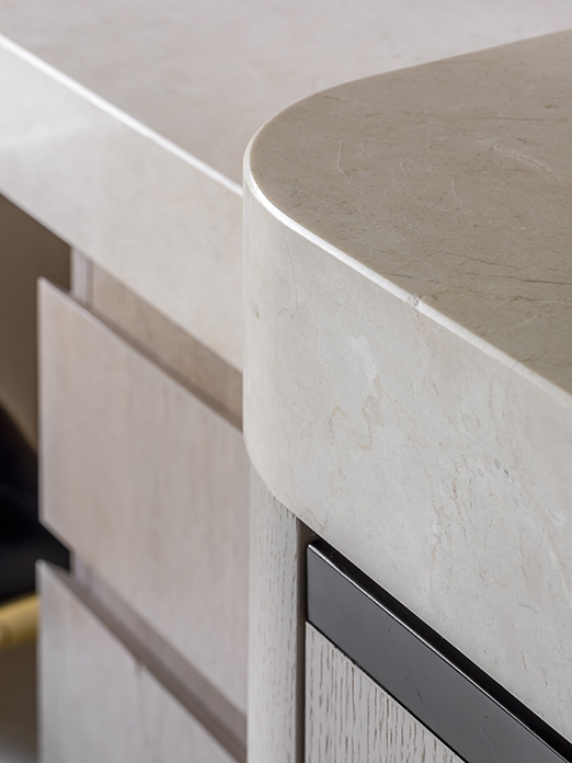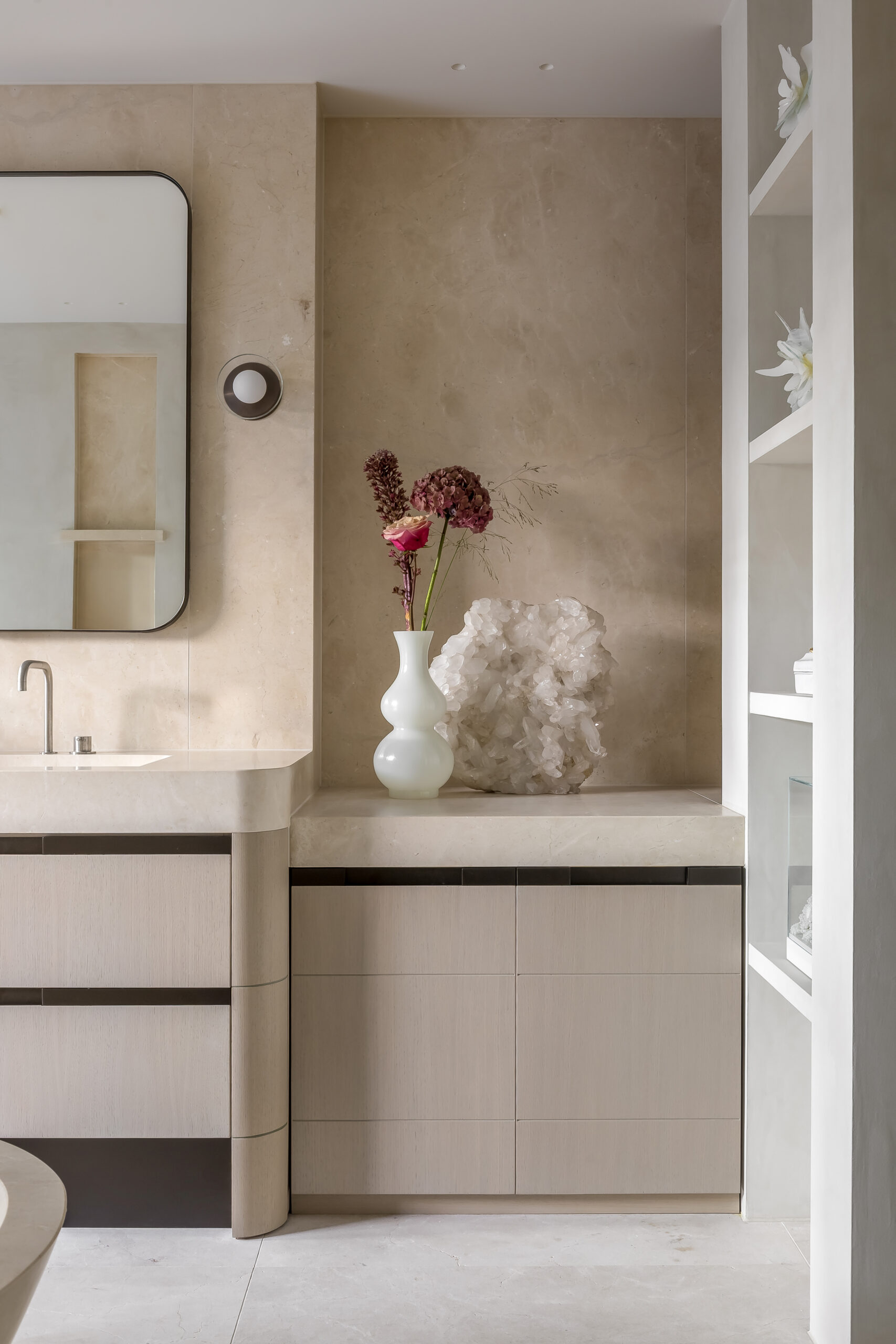 The bathroom is designed as one cohesive whole, with the freestanding bath and washbasin carved from a single piece of natural stone. Soft curves in the vanity and mirrored cabinet ease the strict geometry and introduce a calm rhythm throughout the space. Built-in niches and subtle indirect lighting enhance the serene atmosphere, while the ton-sur-ton palette allows the materials to take centre stage.