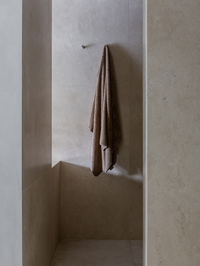 The natural stone floor continues from the entrance, creating a seamless transition between spaces. The result is a bathroom that unites calm, tactility and refinement in a spatial composition shaped by functional and soft forms.