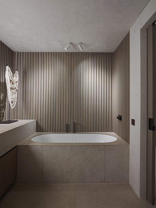 This bathroom was designed as a serene, Feng shui-inspired retreat in the vibrant heart of Amsterdam. A subdued palette and natural materials create a sense of balance and tranquility, radiating openness and calm.