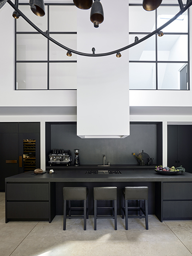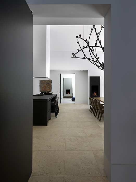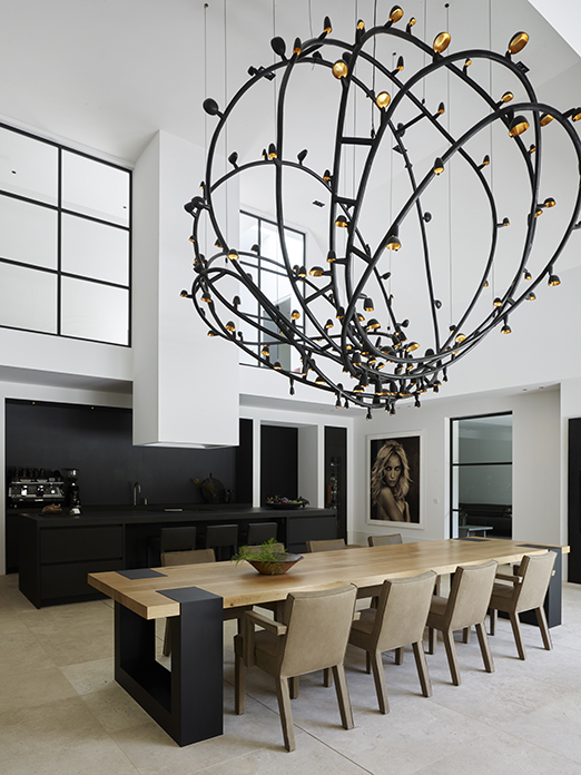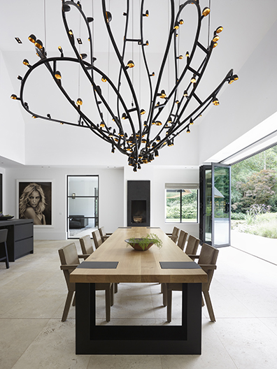 In this generous eat-in kitchen, the Piet Boon ELEMENT kitchen forms the heart of family life. The double-height space feels both airy and grand, accentuated by the sculptural bronze chandelier by Studio Molen.