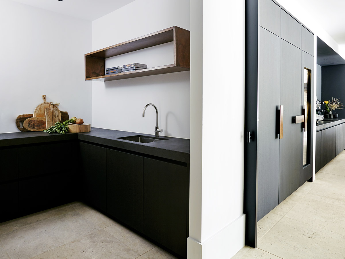 The interior balances soft sand tones with dark brushed oak cabinetry, a black concrete countertop, and copper LANDSCAPE handles. Refined, clear accents add lightness and depth.